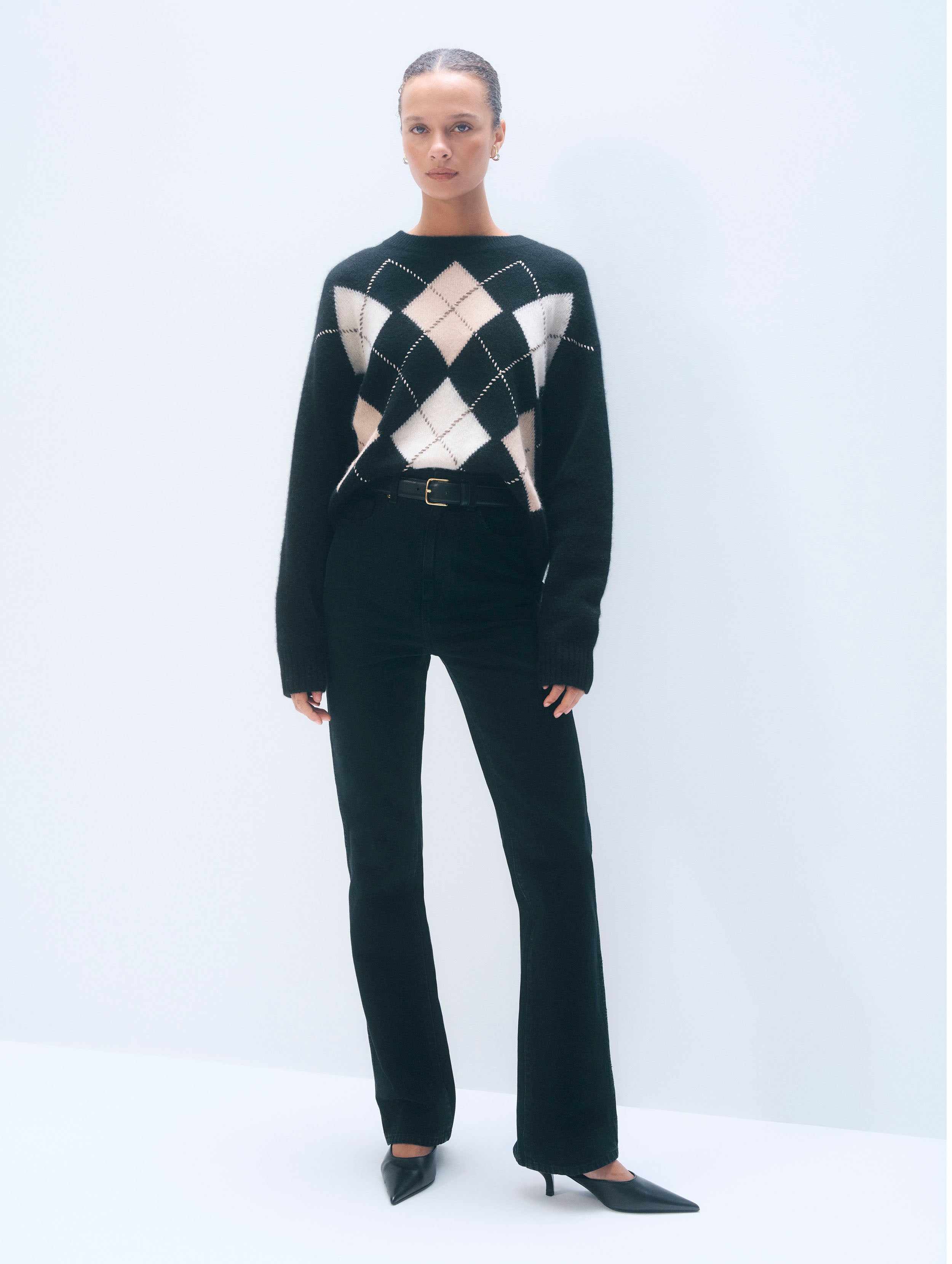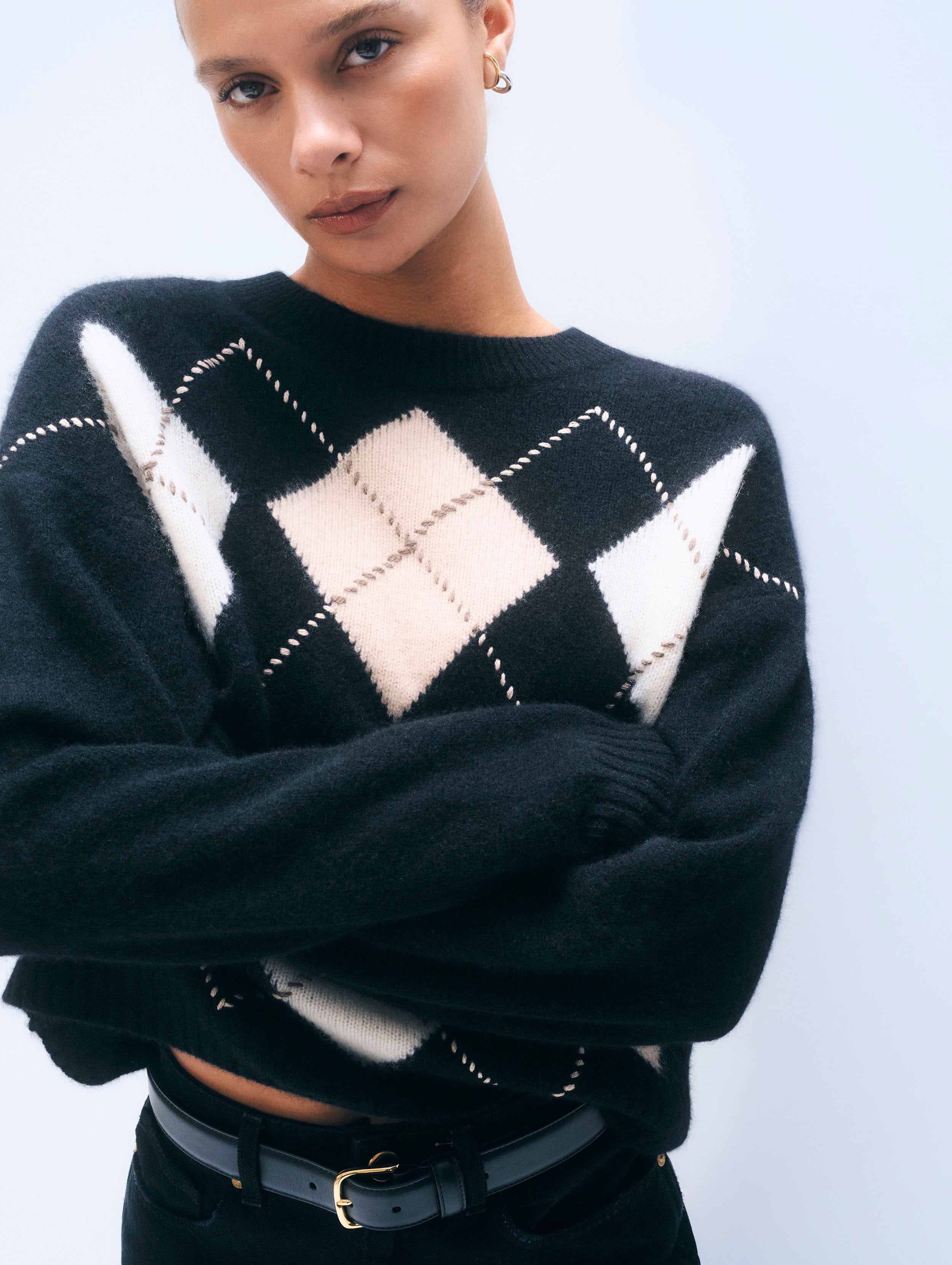 A heritage-inspired crewneck sweater knit from 100% cashmere with an intricate intarsia stitch. The modern argyle motif is perfected with hand-embroidered detailing, offering a luxurious take on a traditional silhouette.