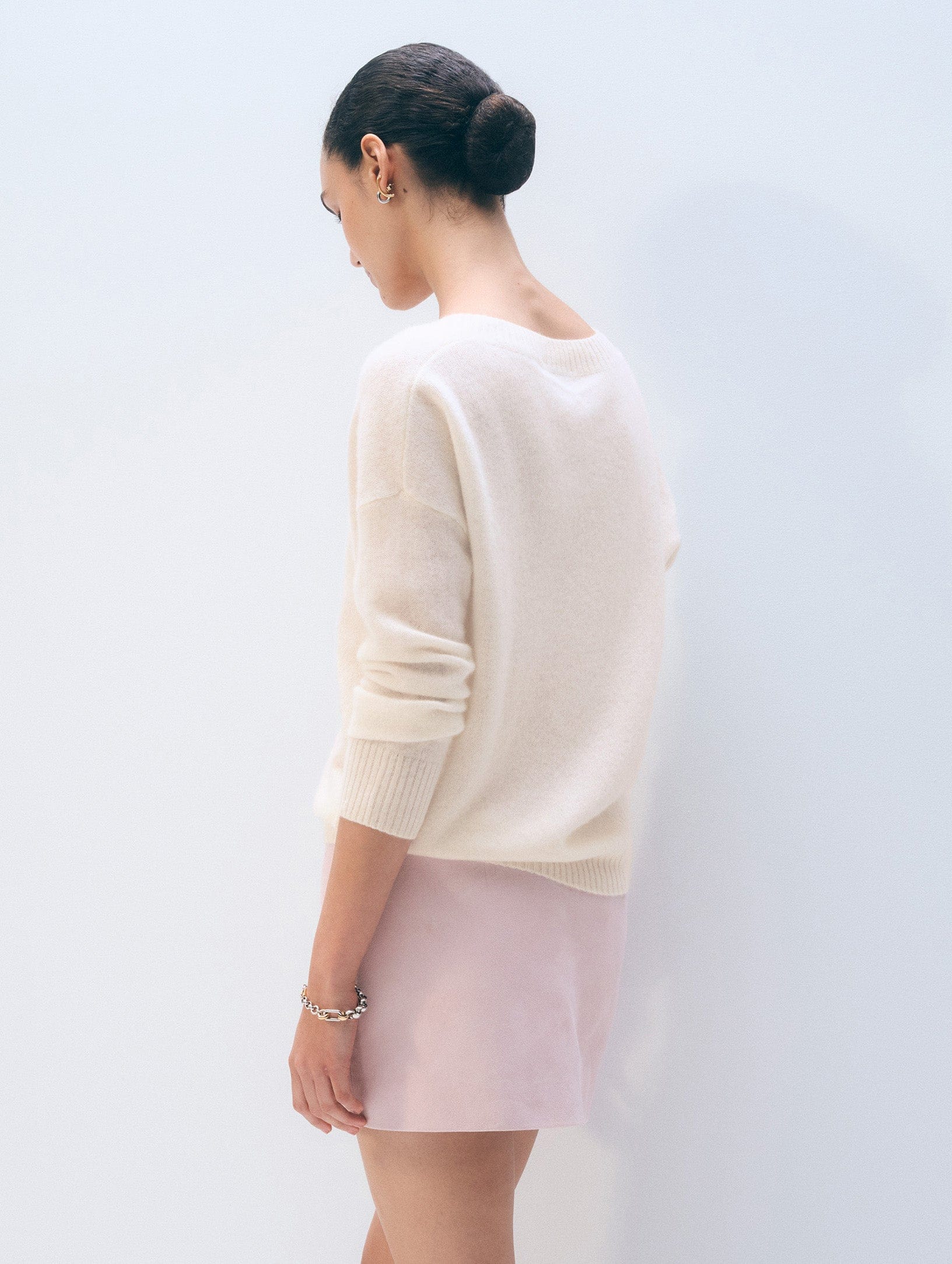 We're known for our Mongolian cashmere, made supremely soft through a custom wash technique. Select cashmere styles are finished with three hand-embroidered bar tacks at the back neck or side seam—an abstract "W" that signifies the White & Warren touch.
