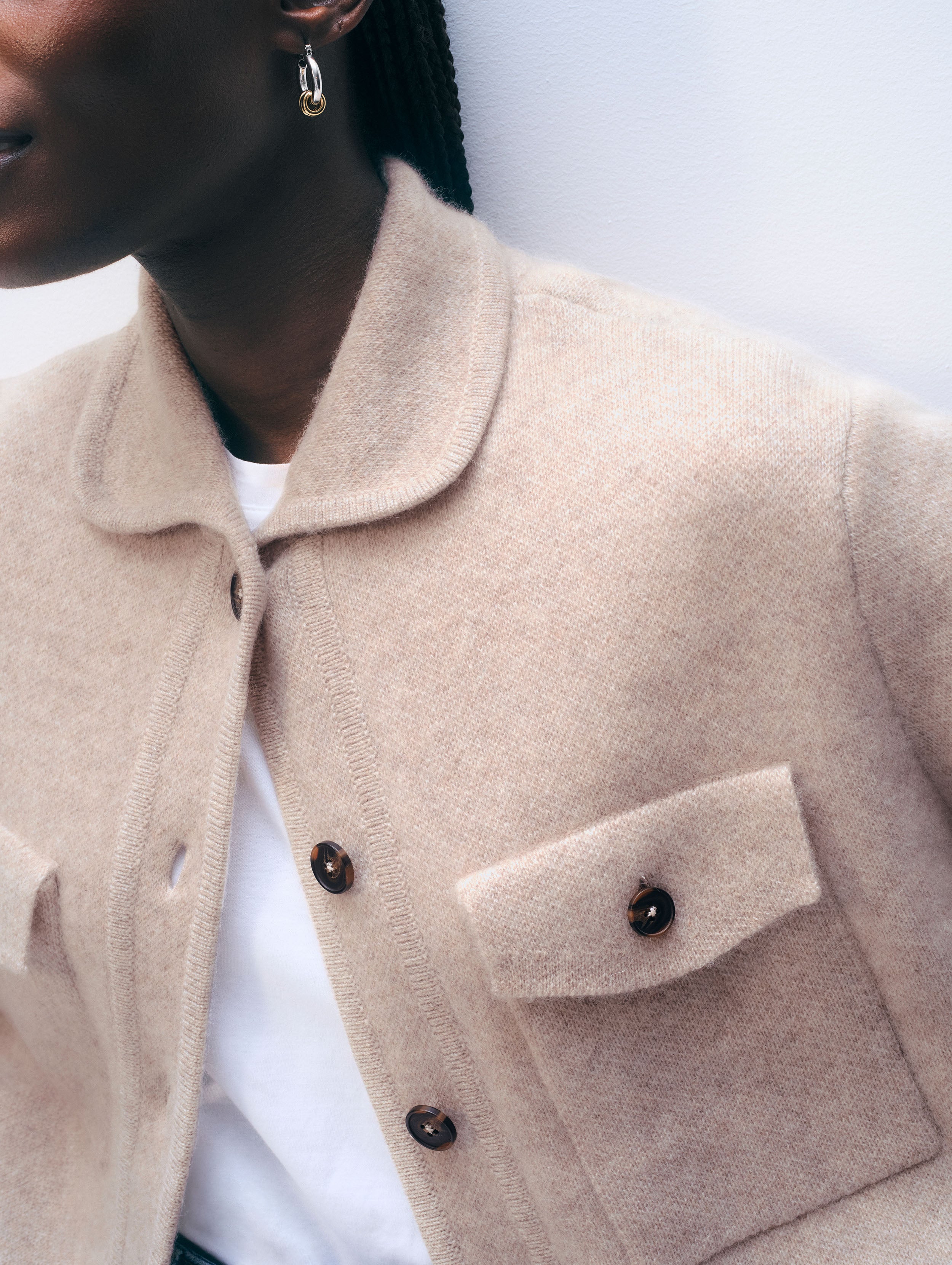Polished and versatile. Crafted from 100% cashmere this structured, oversized layer features buttoned pockets and cuffs for functional style.