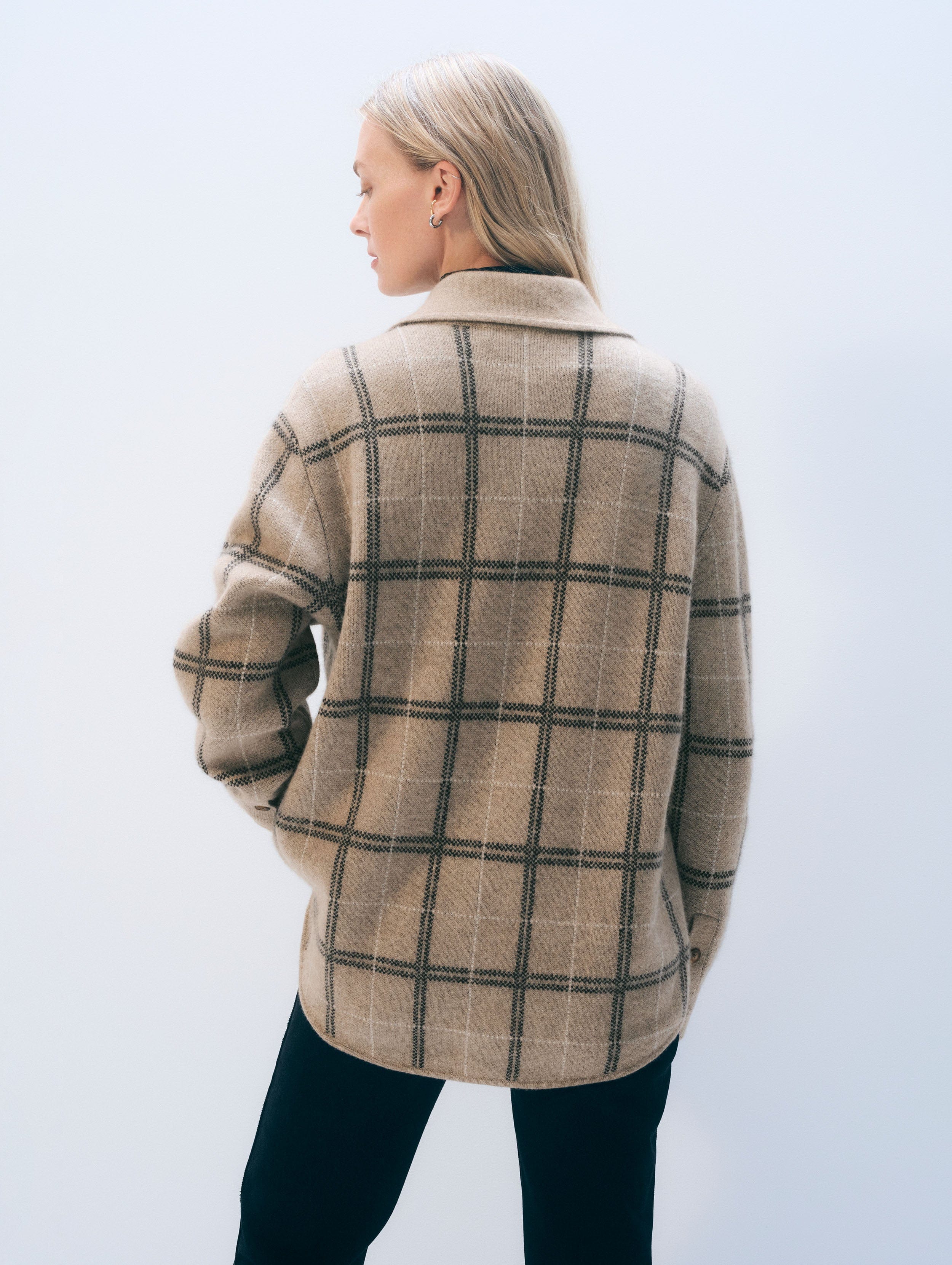 Polished and versatile. Crafted from 100% cashmere in a windowpane plaid, this structured, oversized layer features buttoned pockets and cuffs for functional style.