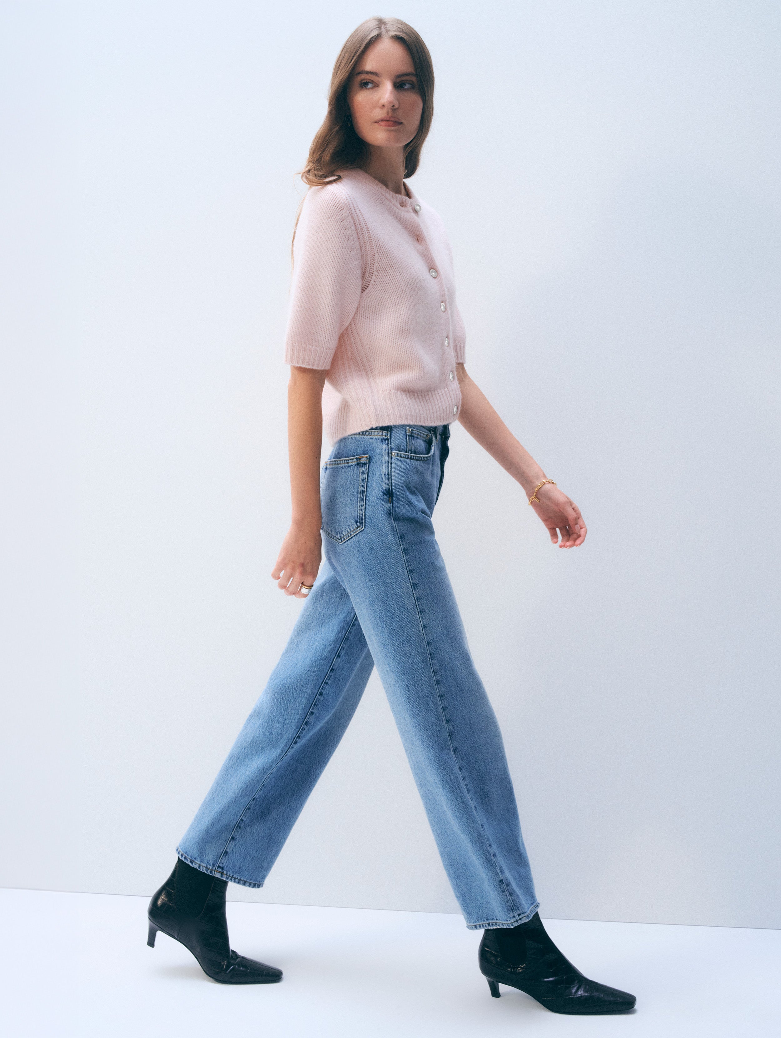 This ultra-light Cashmere Short Sleeve Cardigan was designed for upscale dressing with horn buttons and a slightly cropped length. Knit loosely with four ends of cashmere, this featherweight style feels like it is floating on your body.