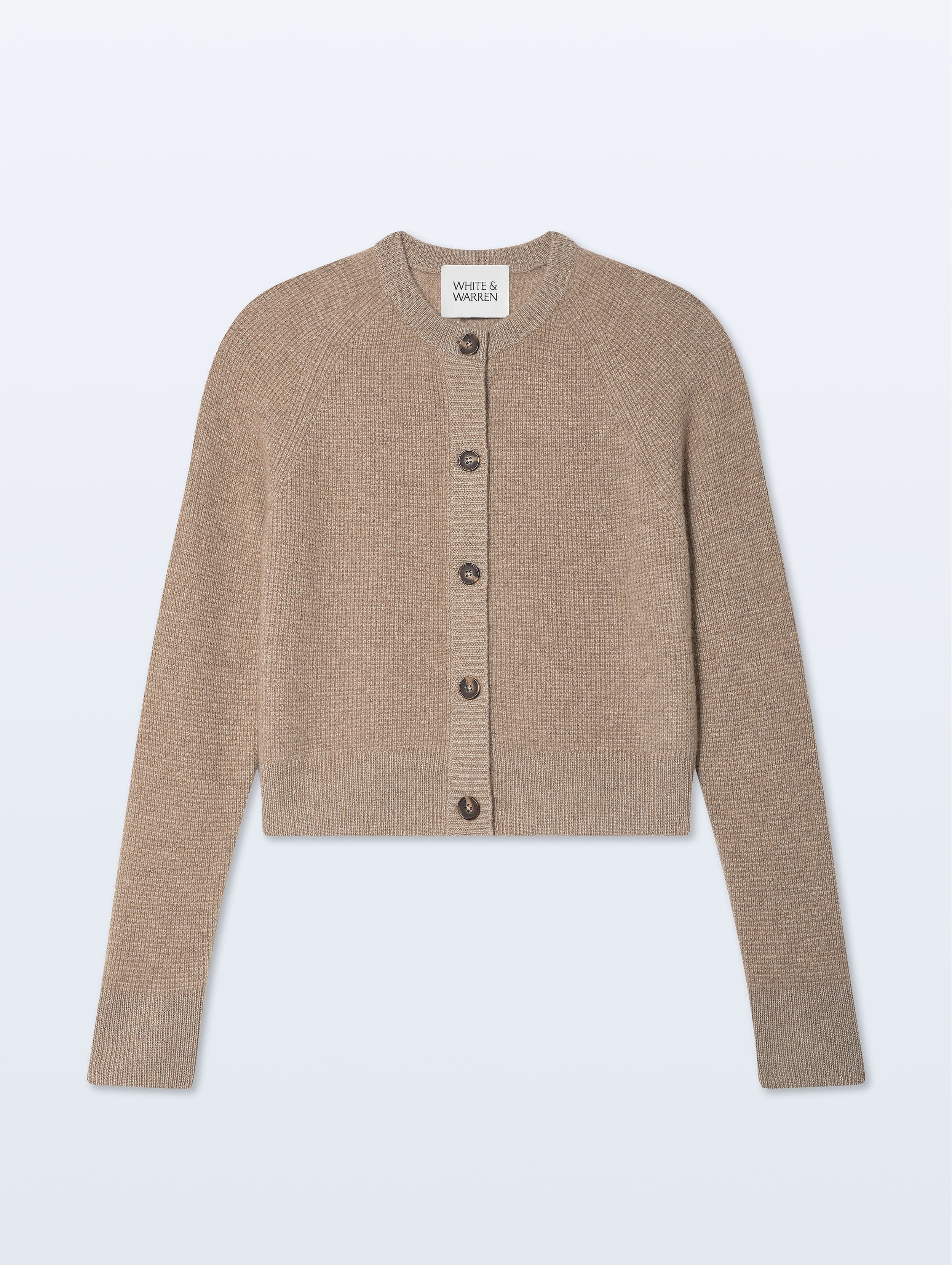 A textured twist on an everyday layer. This cardigan is knit from 100% cashmere in a waffle stitch for subtle dimension and softness. Designed with raglan sleeves and a shorter silhouette, reaching the top of the hip, it's a layer you'll reach for year-round.