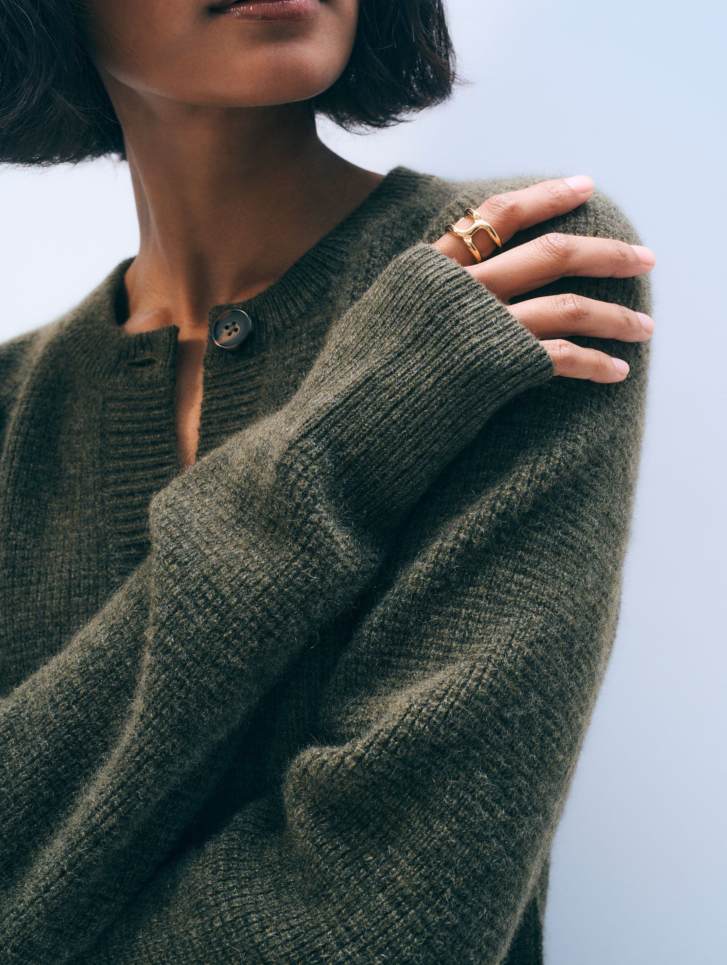 A textured twist on an everyday layer. This cardigan is knit from 100% cashmere in a waffle stitch for subtle dimension and softness. Designed with raglan sleeves and a shorter silhouette, reaching the top of the hip, it's a layer you'll reach for year-round.