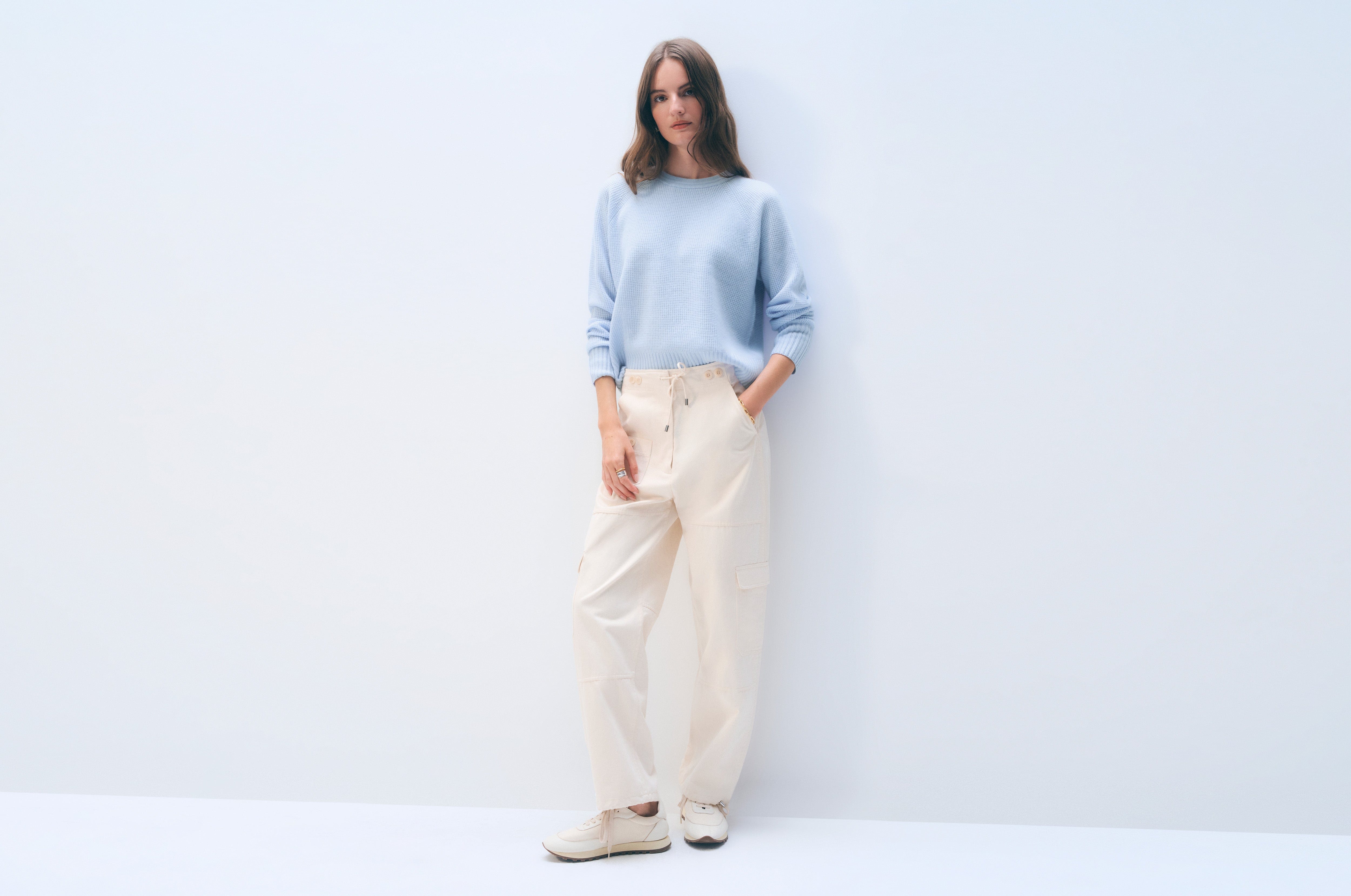 We're known for our Mongolian cashmere, made supremely soft through a custom wash technique. Select cashmere styles are finished with three hand-embroidered bar tacks at the back neck or side seam—an abstract "W" that signifies the White & Warren touch.