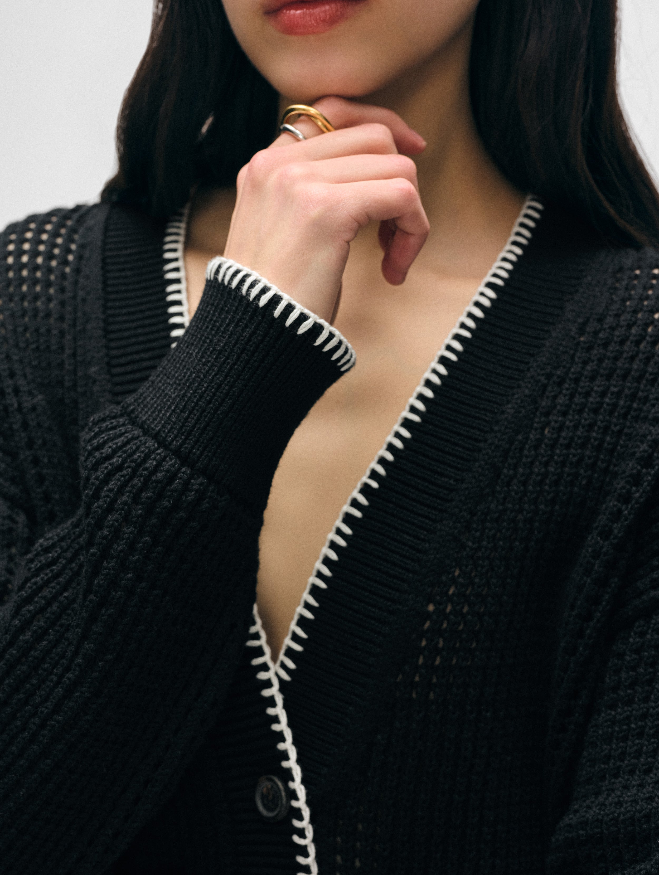 Cotton Blanket Trim Cardigan | Black/Ivory