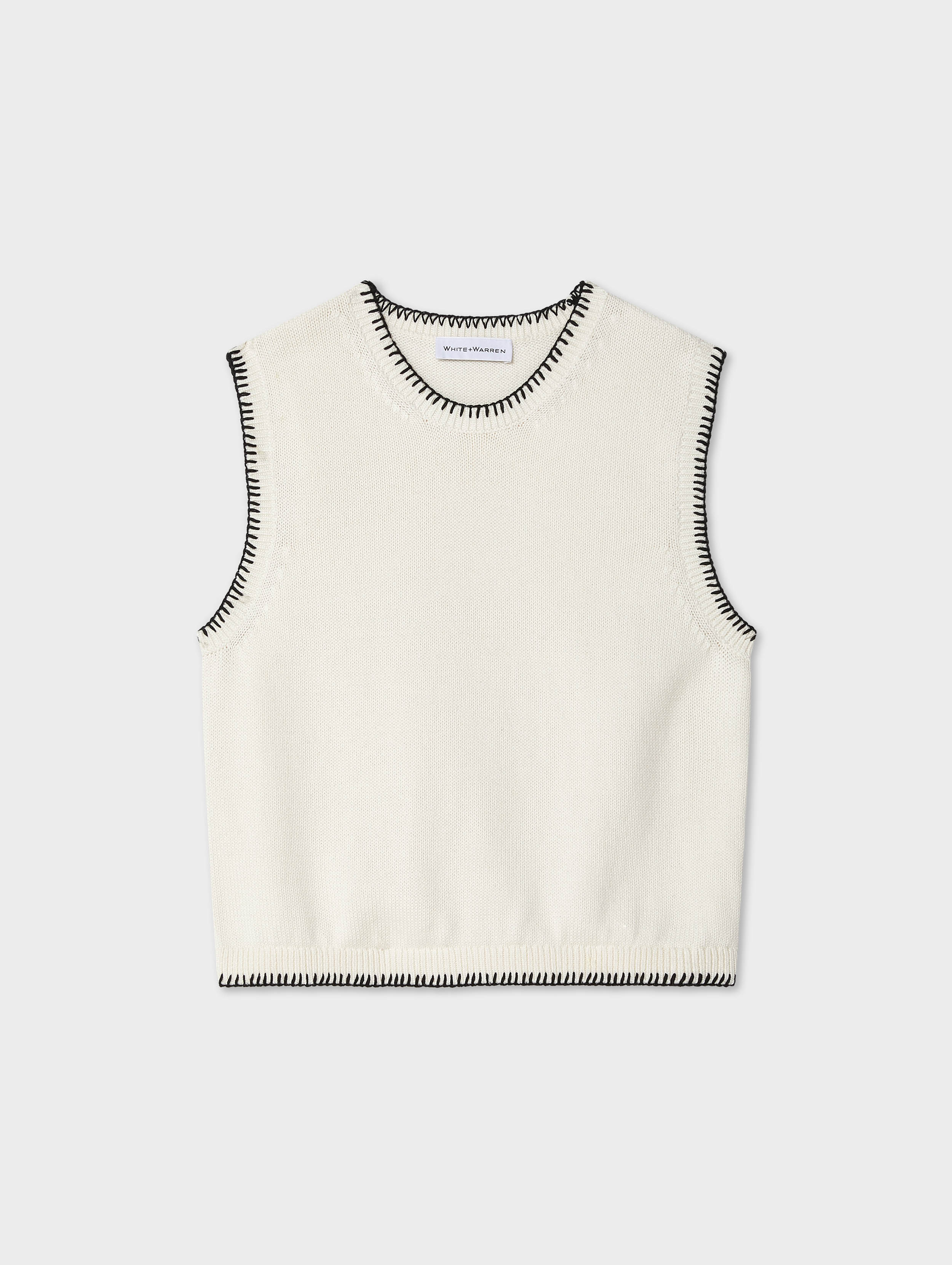 With its clean lines and versatile silhouette, the Cotton Blanket Trim Tank showcases the beauty of handcrafted detail. Its body is expertly machine-knit with premium 100% organic cotton, while the hand-stitched detailing along the trims adds an artisanal touch. Layer under the matching Cotton Blanket Trim Cardigan.