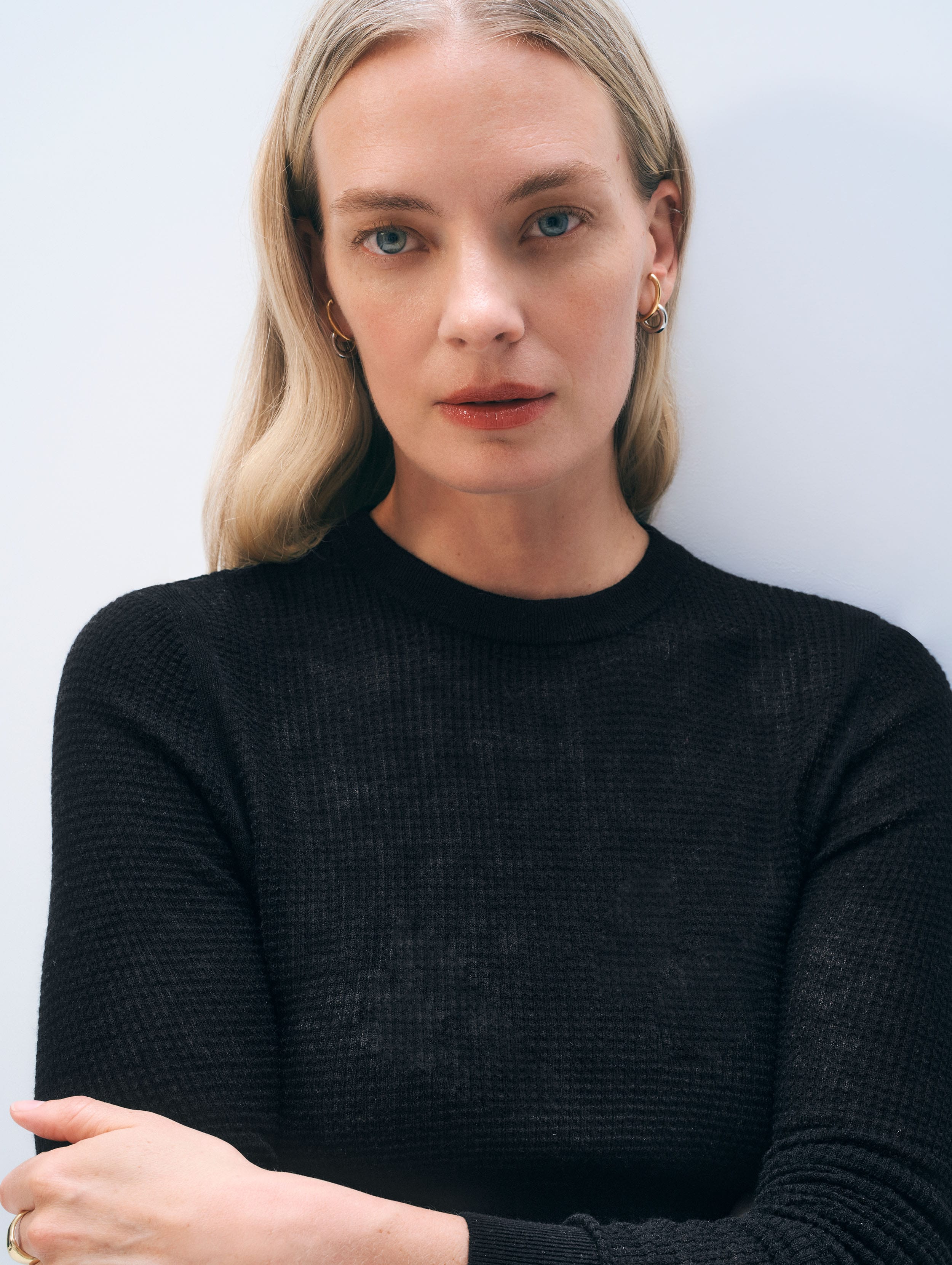 A throw-on-and-go staple with a weightless handfeel. Knit from our lightest yarn of the season, a superfine wool-cashmere blend known for its cloud-like softness, semi-sheer drape, and ample breathability. The waffle stitch adds subtle texture to its relaxed silhouette, elevating this transitional essential.