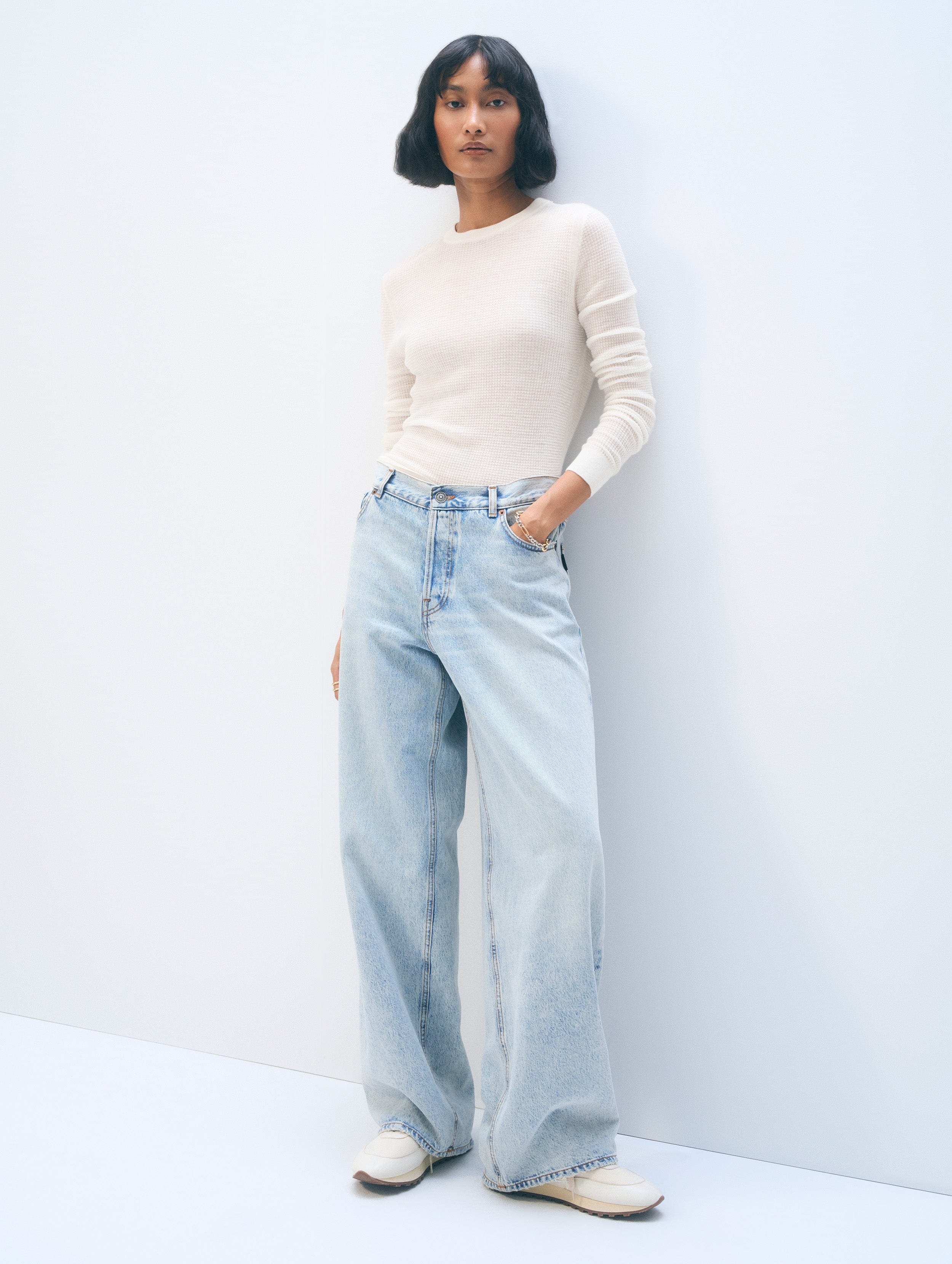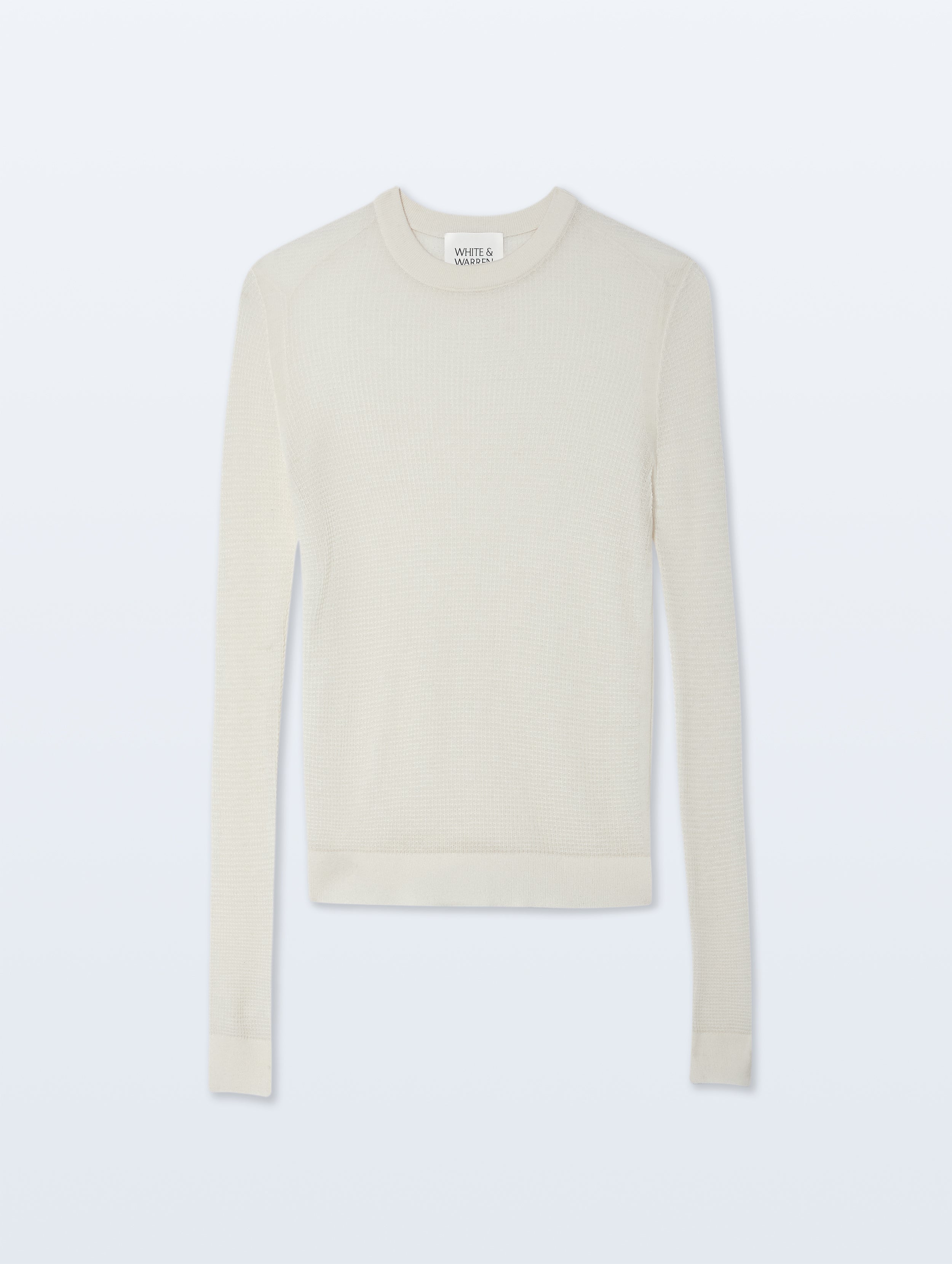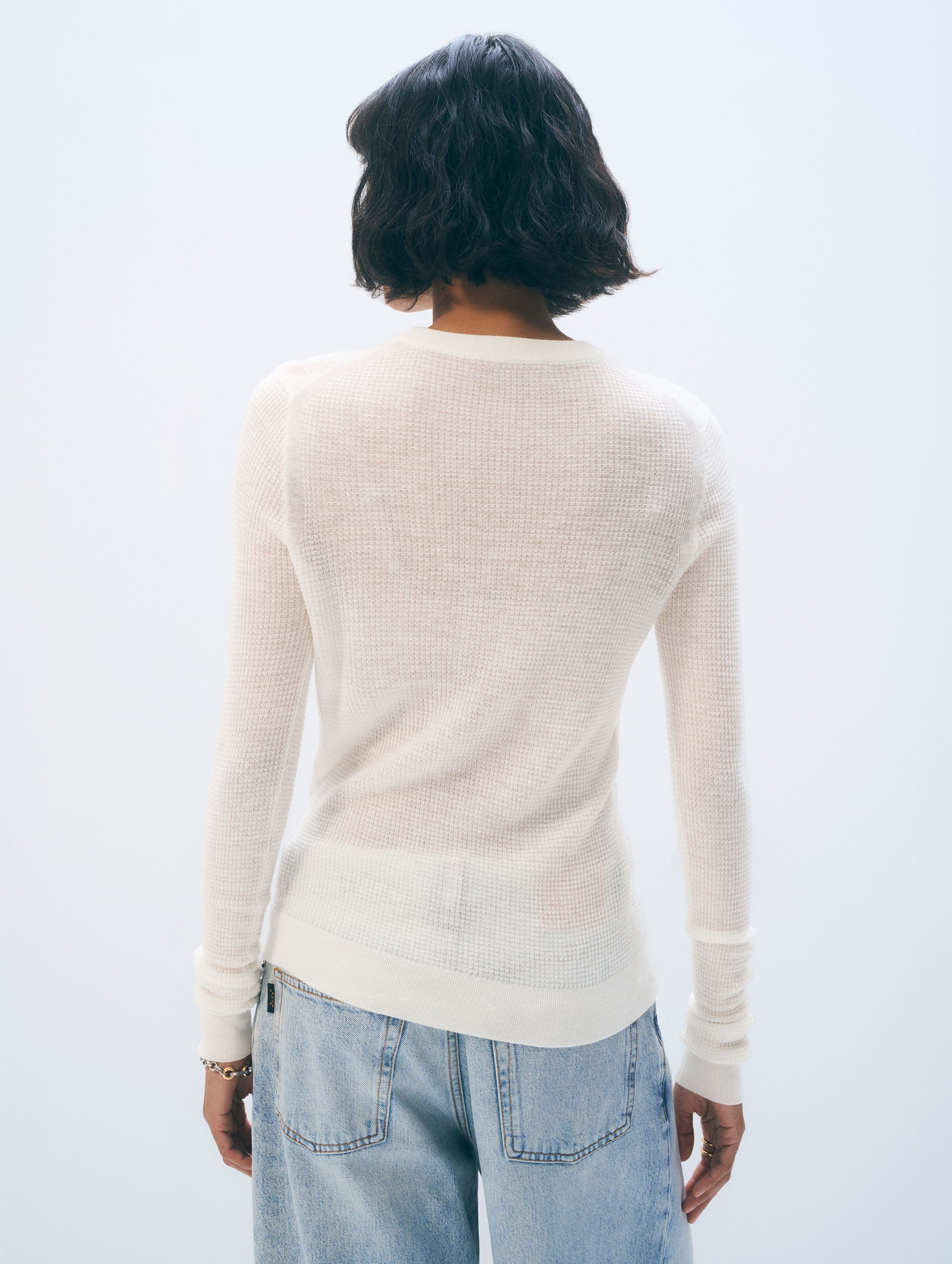A throw-on-and-go staple with a weightless handfeel. Knit from our lightest yarn of the season, a superfine wool-cashmere blend known for its cloud-like softness, semi-sheer drape, and ample breathability. The waffle stitch adds subtle texture to its relaxed silhouette, elevating this transitional essential.