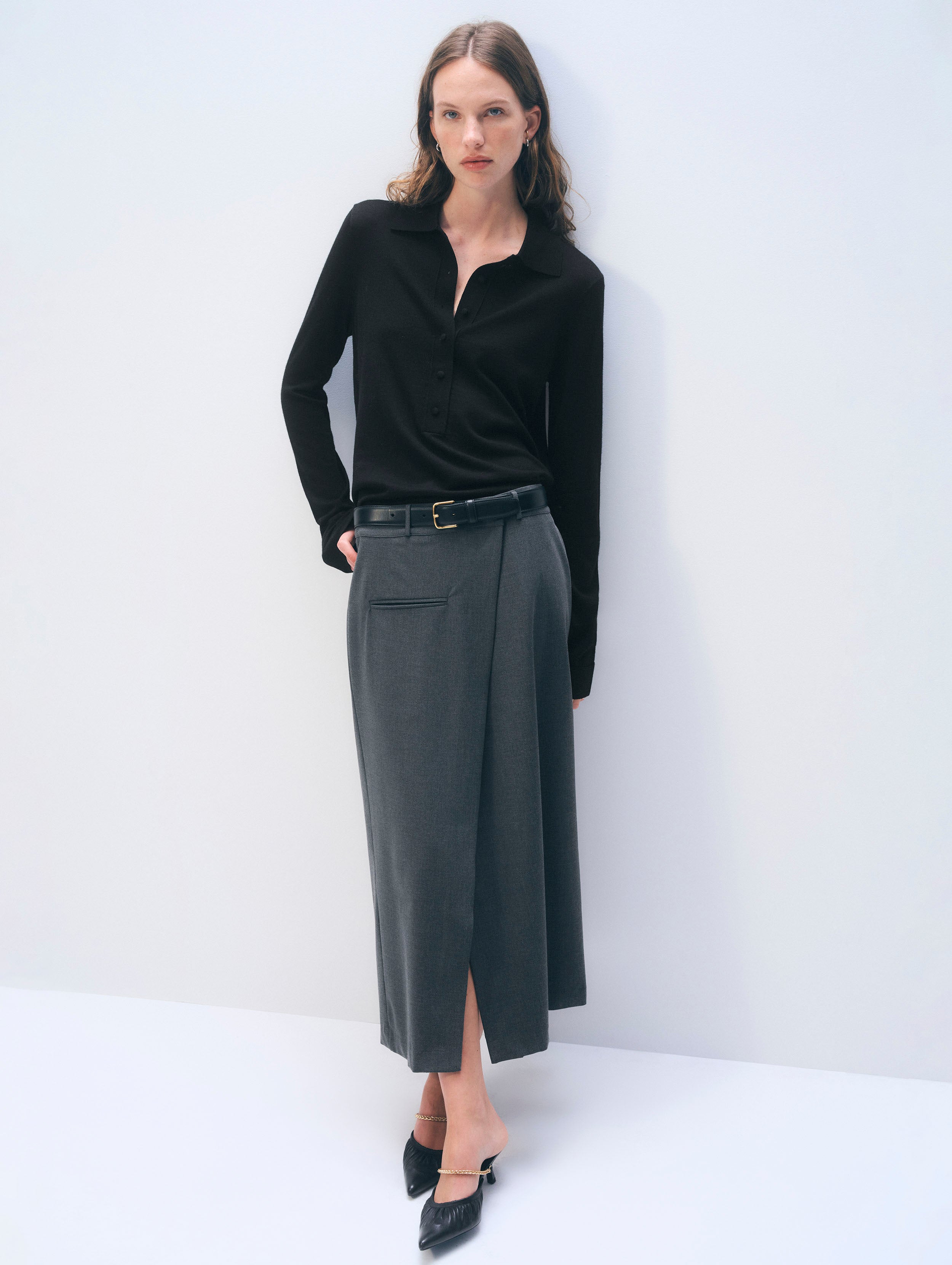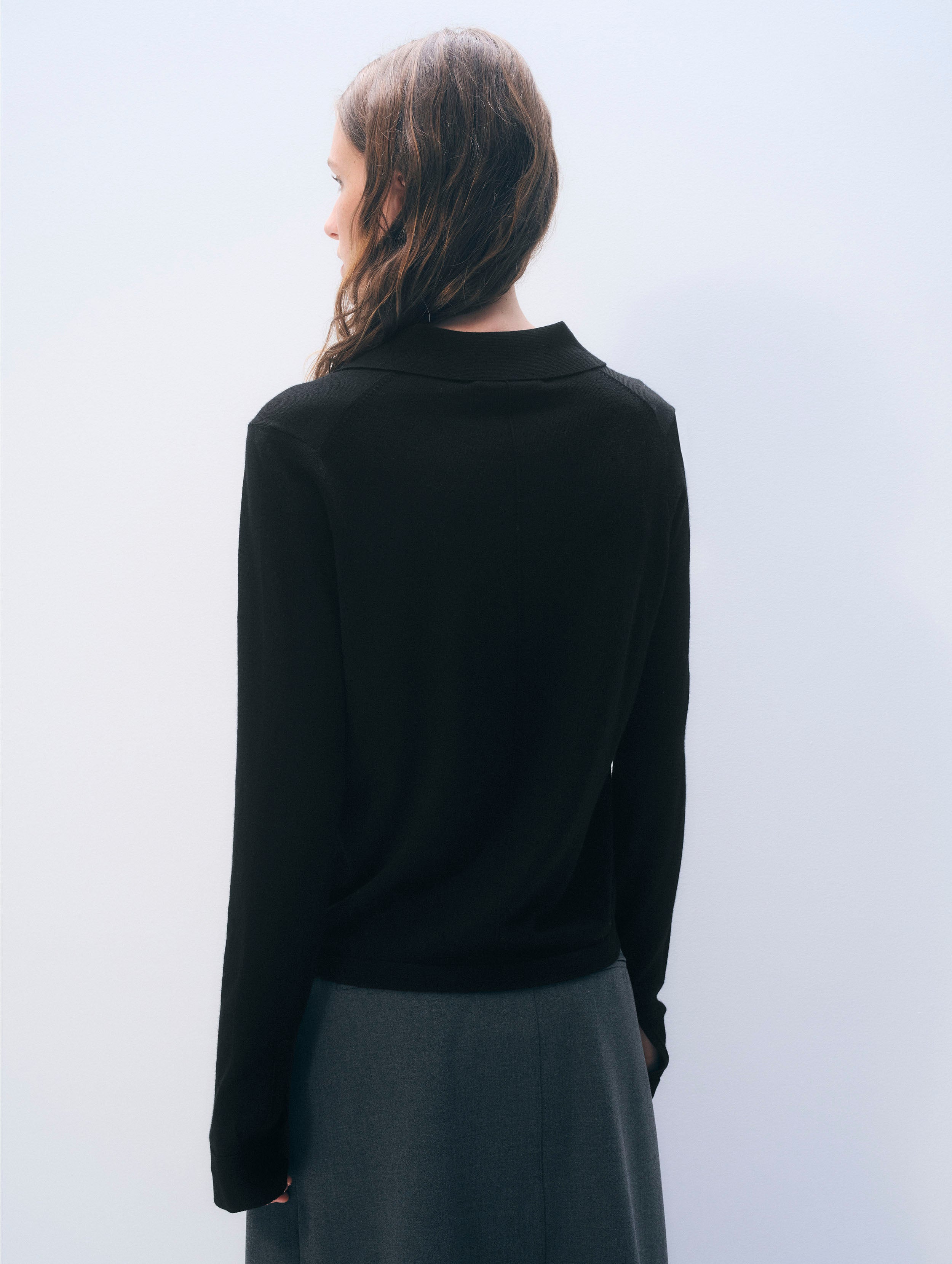 A refined polo. Finely knit from superfine merino wool, this easy silhouette features a crisp collar and deep placket with covered buttons for an understated, elevated finish.